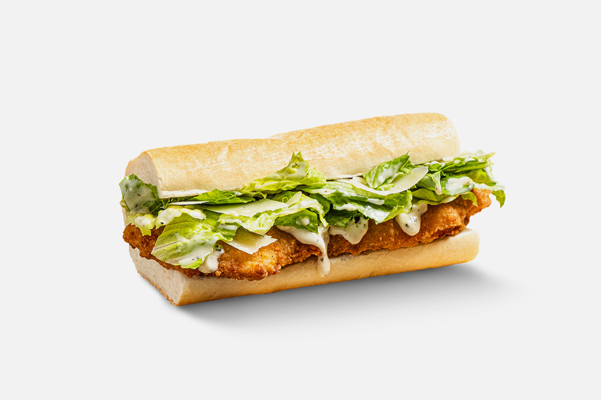 Thin Breaded Chicken Cutlets topped with our crisp Caesar salad and shaved parm served on toasted buttered Italian bread.